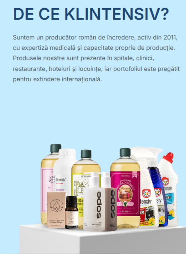 Suntem un producător român de încredere, activ din 2011, cu expertiză medicală și capacitate proprie de producție. Produsele nostre sunt prezente în spitale, clinici, restaurante, hoteluri și locuințe, iar portofoliul este pregătit pentru extindere internațională.