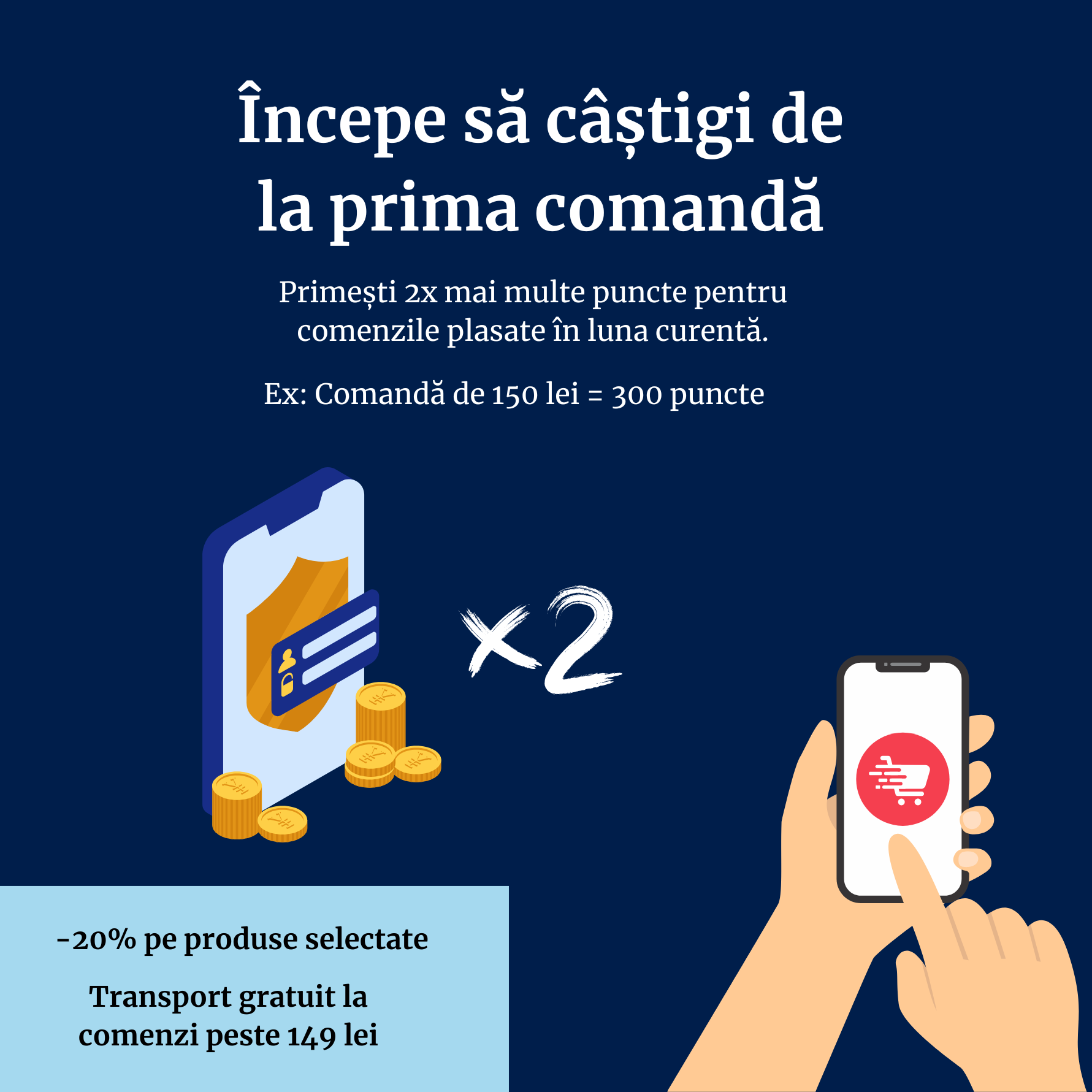 Primești puncte la fiecare achiziție și le transformi în beneficii reale: reduceri, transport gratuit sau store credit.